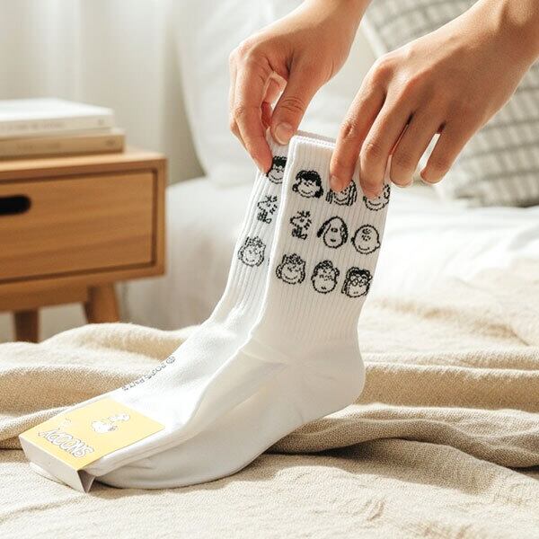 スヌーピーとその仲間たちがデザインされた「PEANUTS スヌーピー フレンズ ソックス」は、家族みんなで楽しめるミドル丈の靴下です。