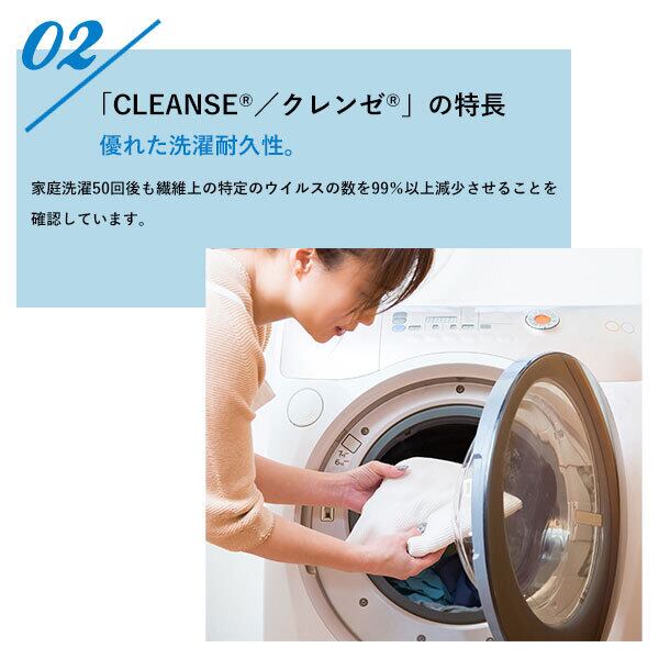 ご家庭で50回洗濯しても、繊維上の特定のウイルスの数を99%以上減少させます。