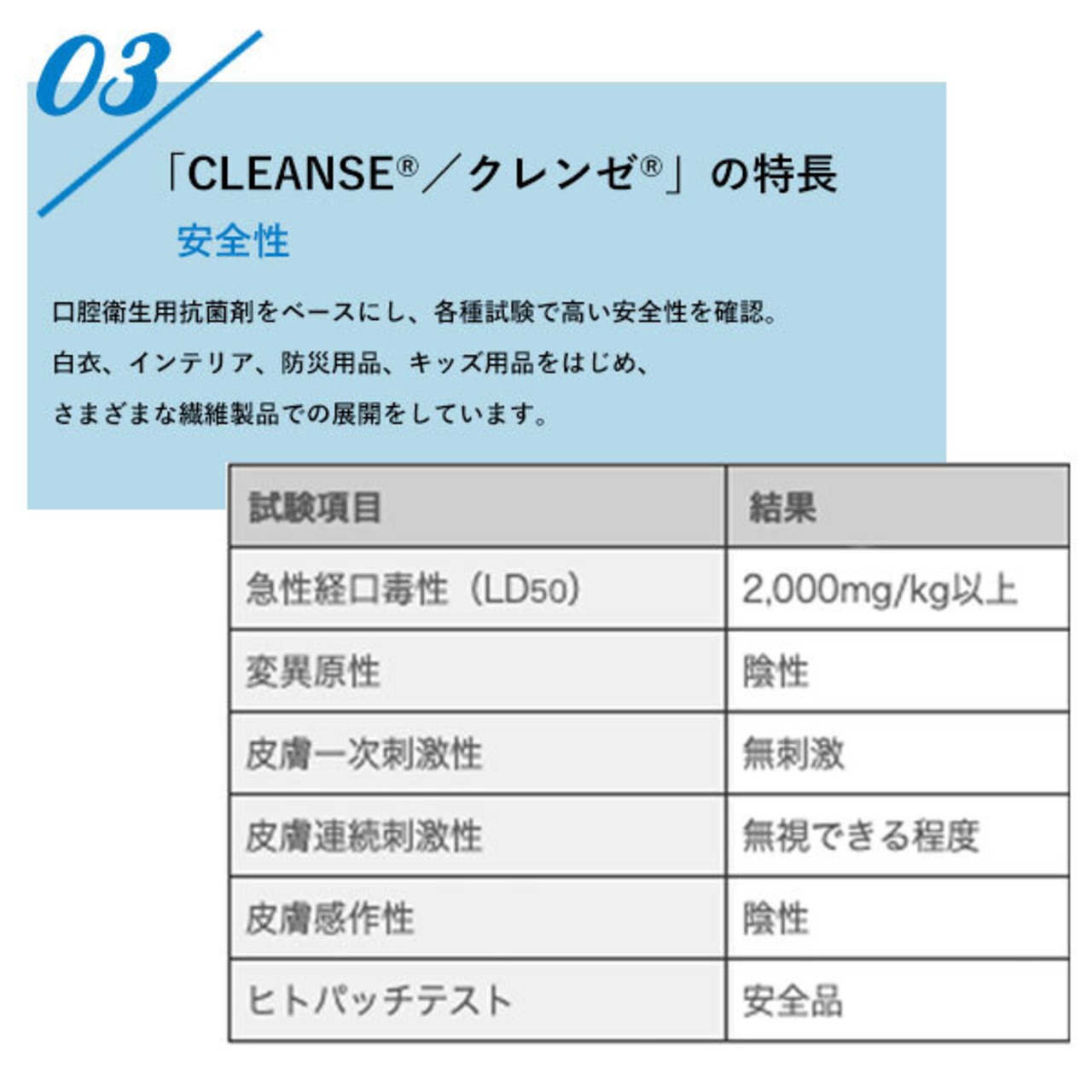 口腔衛生用抗菌剤をベースにし、各種試験で高い安全性を確認しています。