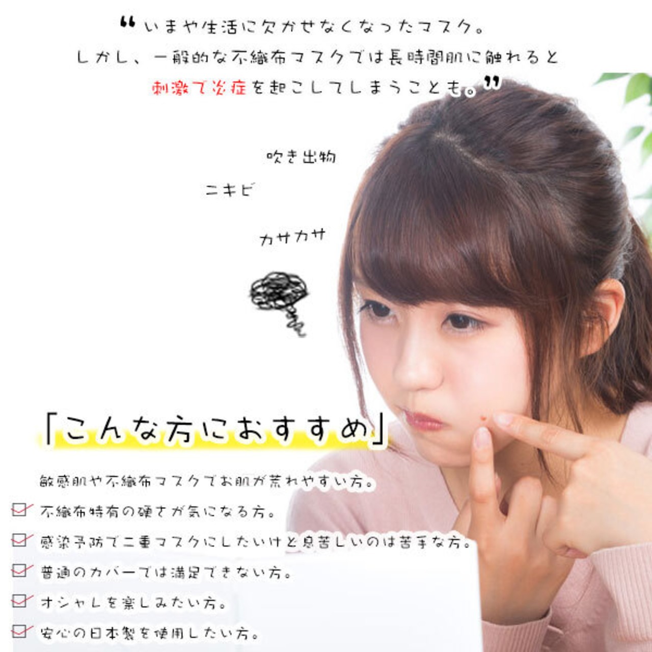 不織布特有の硬さが気になる方、敏感肌や不織布マスクでお肌が荒れやすい方、